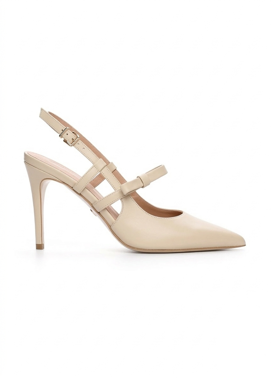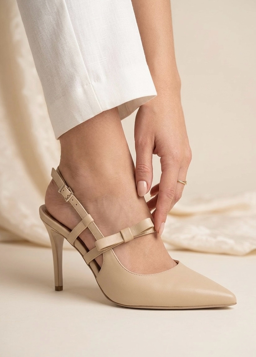 Beżowe skórzane czółenka z kokardką BELLA BEIGE ✨ wykonane ręcznie w Polsce. Szpilka 9 cm, regulowany pasek i subtelna kokardka tworzą elegancki, kobiecy model na każdą okazję.
