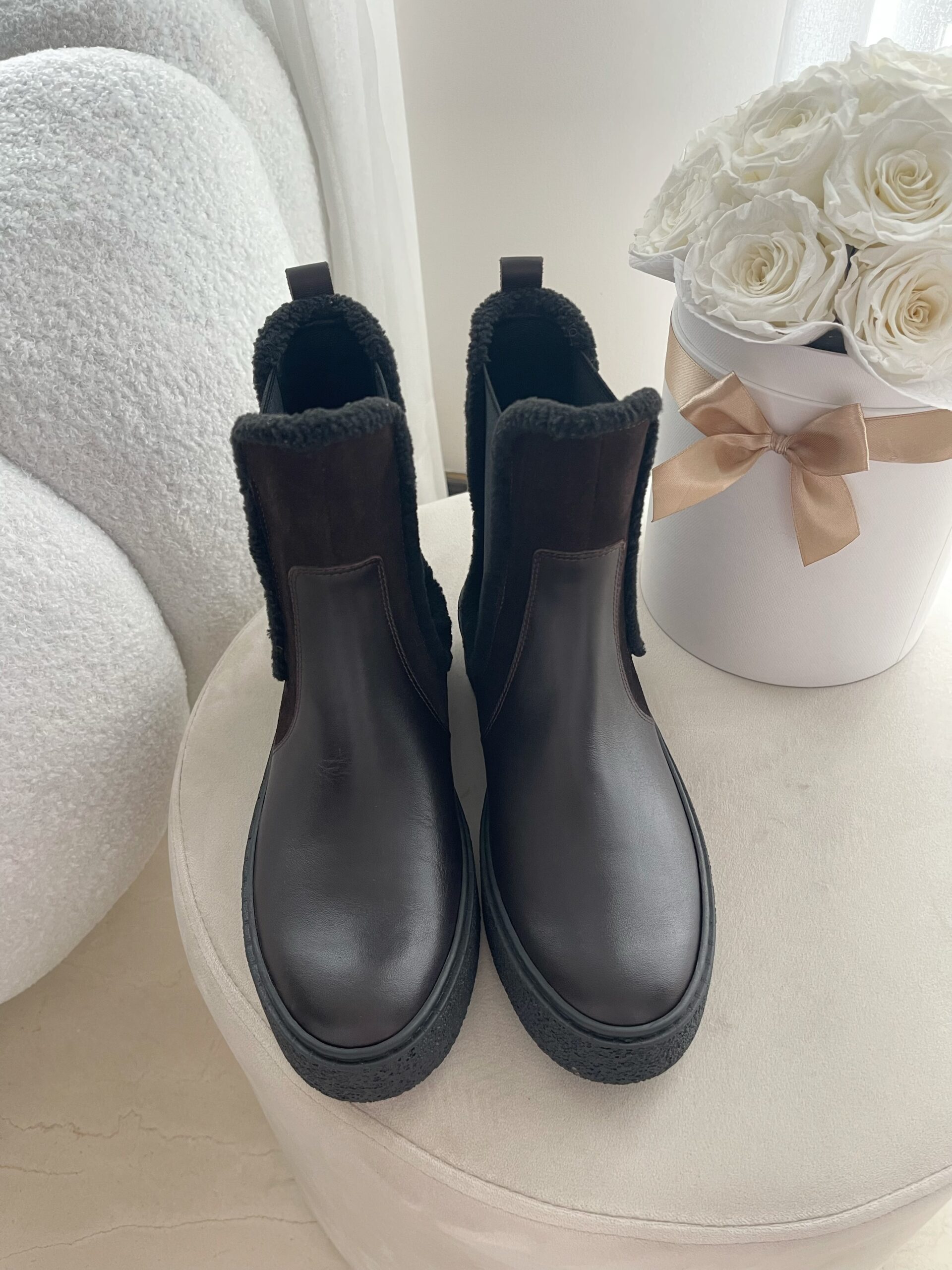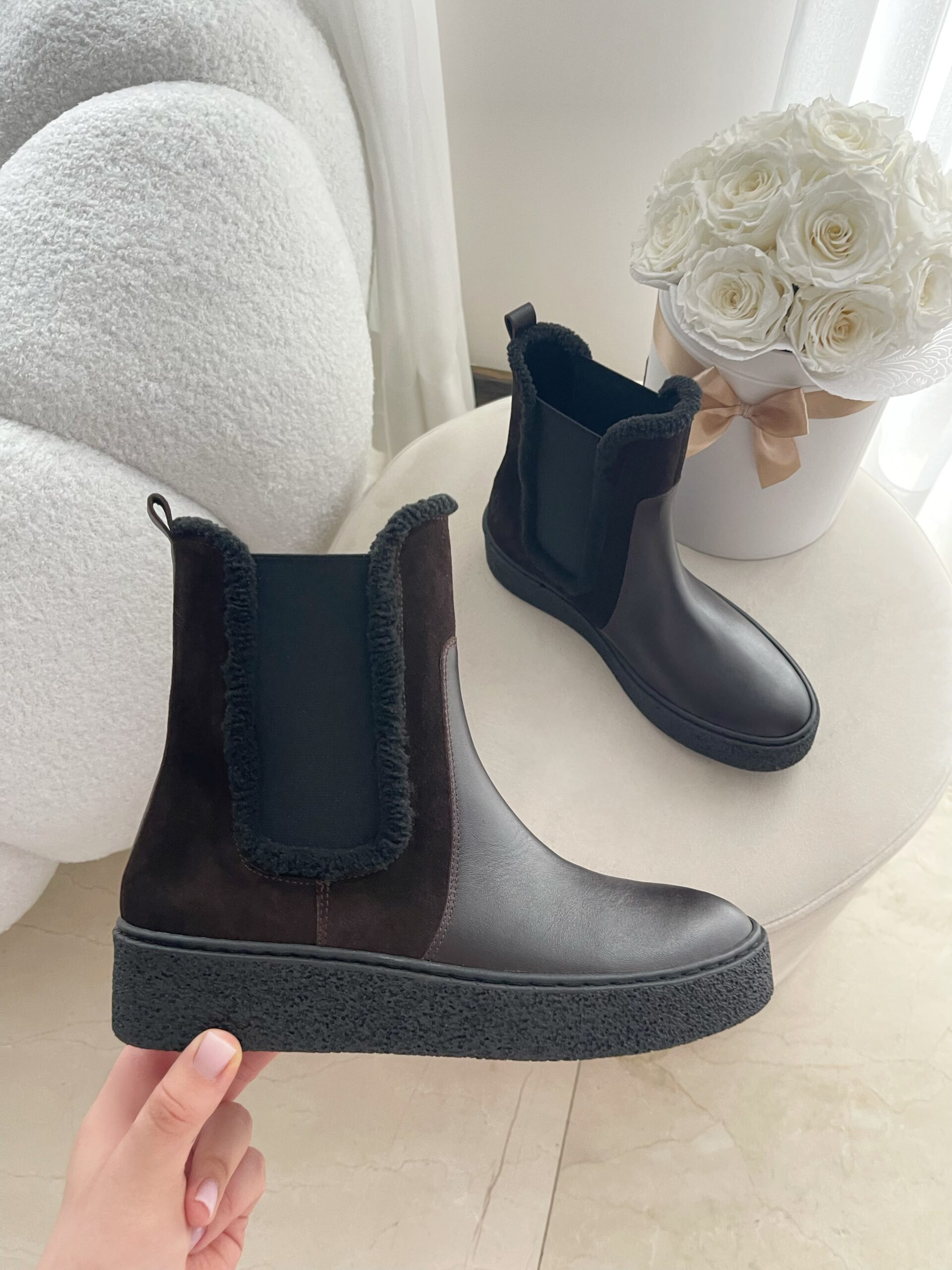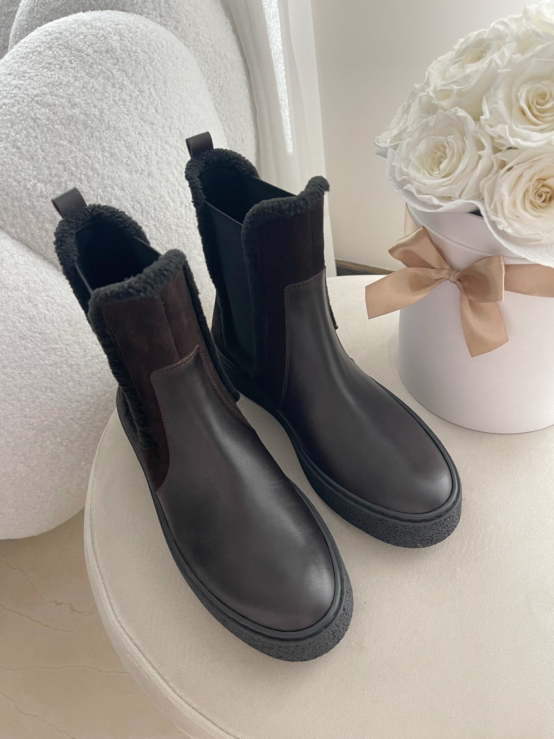 Elastyczna guma ułatwiająca zakładanie delikatnie dopasowuje się do nogi, dlatego codzienne użytkowanie jest wyjątkowo komfortowe 🤎. Guma została otoczona miękkim kożuszkiem, co sprawia, że botki są jeszcze wygodniejsze i przyjemniejsze w noszeniu ✨
