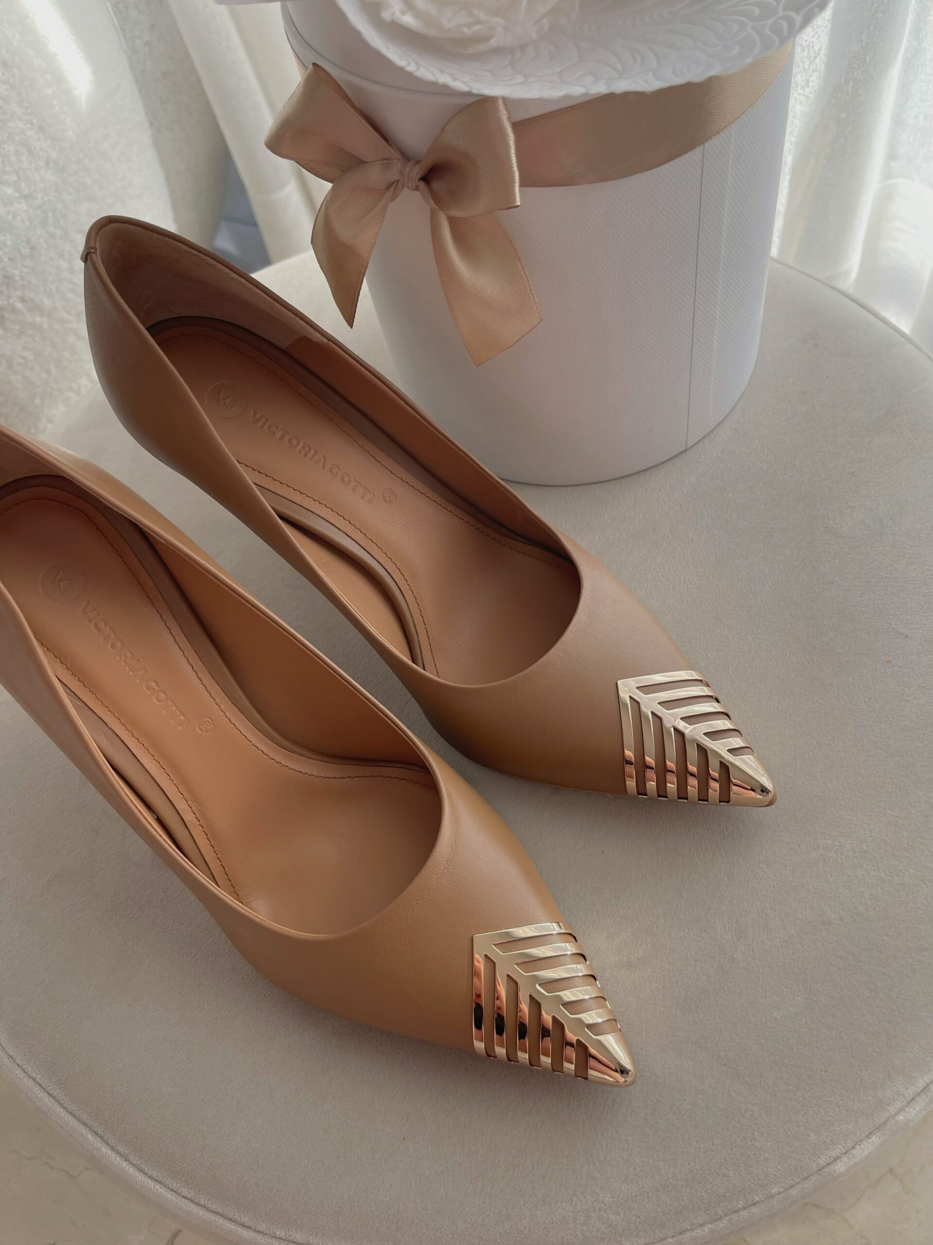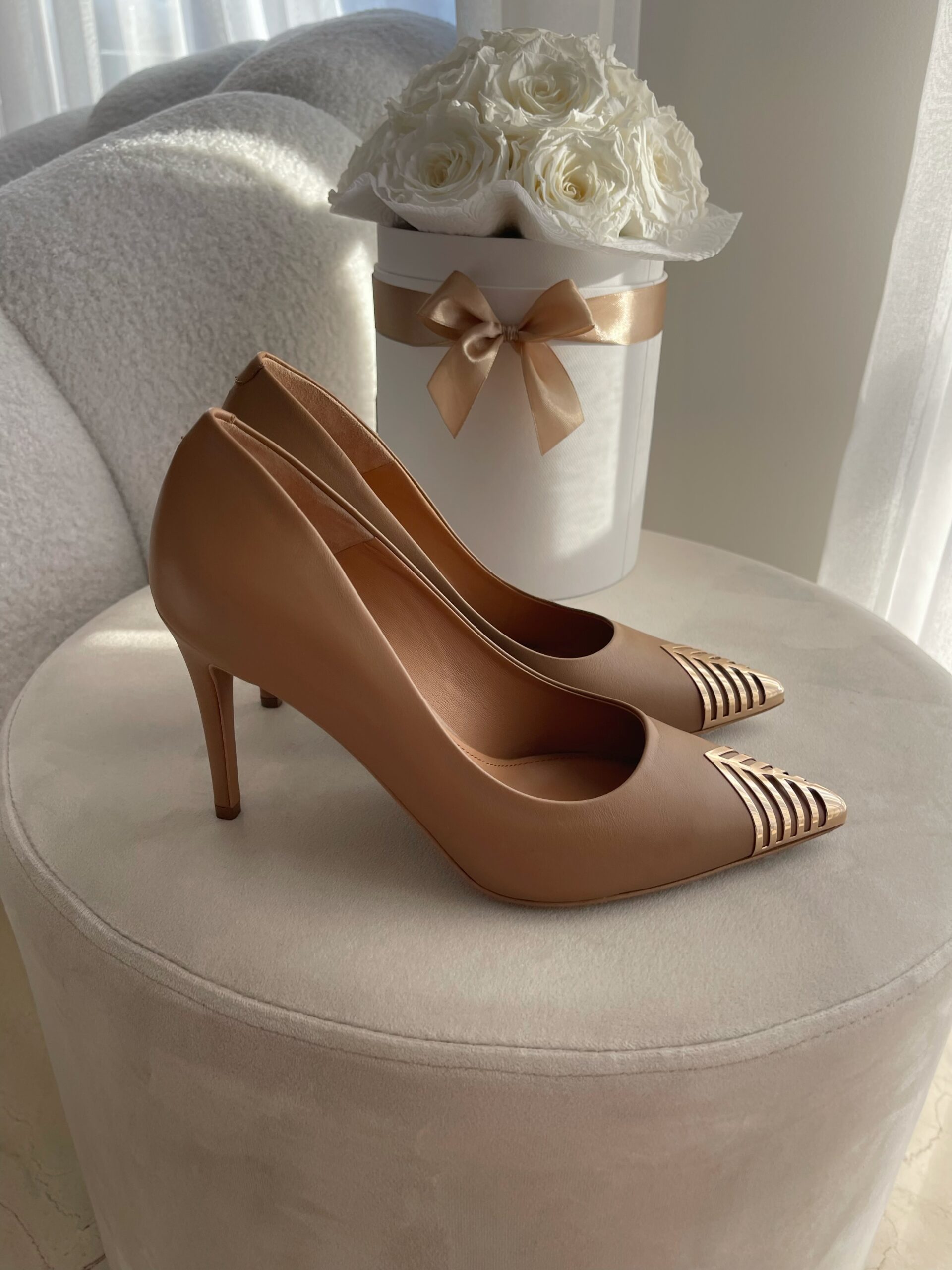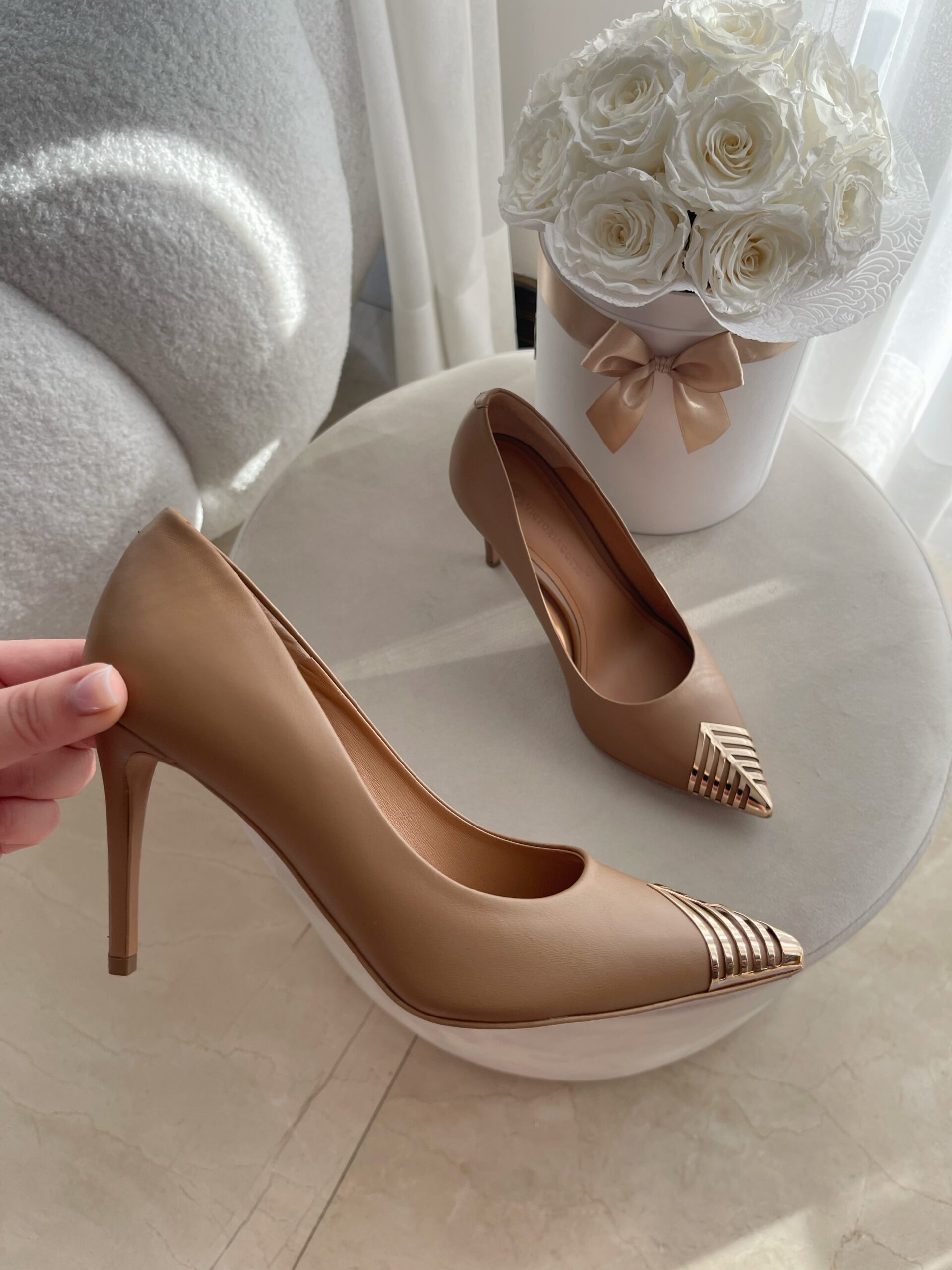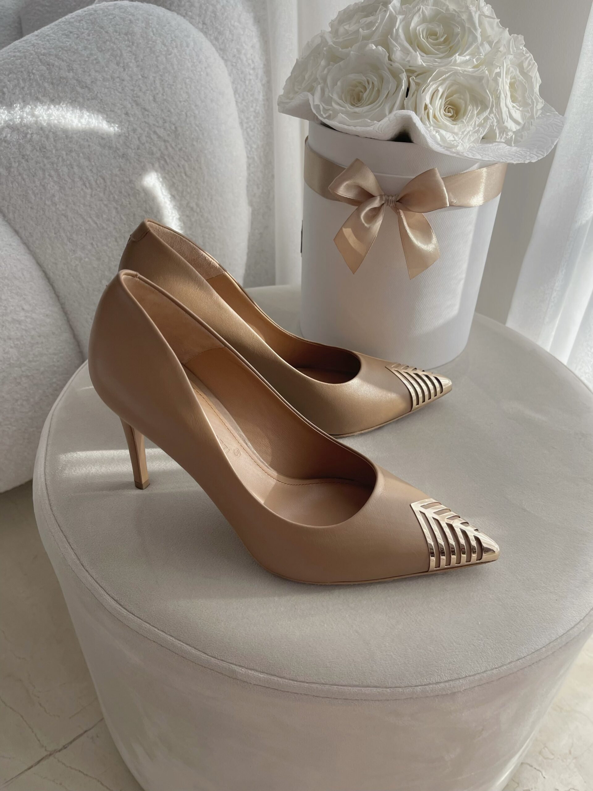 Smukły nosek w szpic wysmukla stopę, dlatego czółenka pięknie prezentują się na nodze. Dodatkowo wygodna szpilka 9 cm sprawia, że model idealnie sprawdzi się w pracy biurowej, a także podczas spotkań i okazji wizytowych. Złota ozdoba na nosku nadaje całości luksusowego charakteru, dzięki czemu czółenka przyciągają uwagę, zachowując elegancki styl.