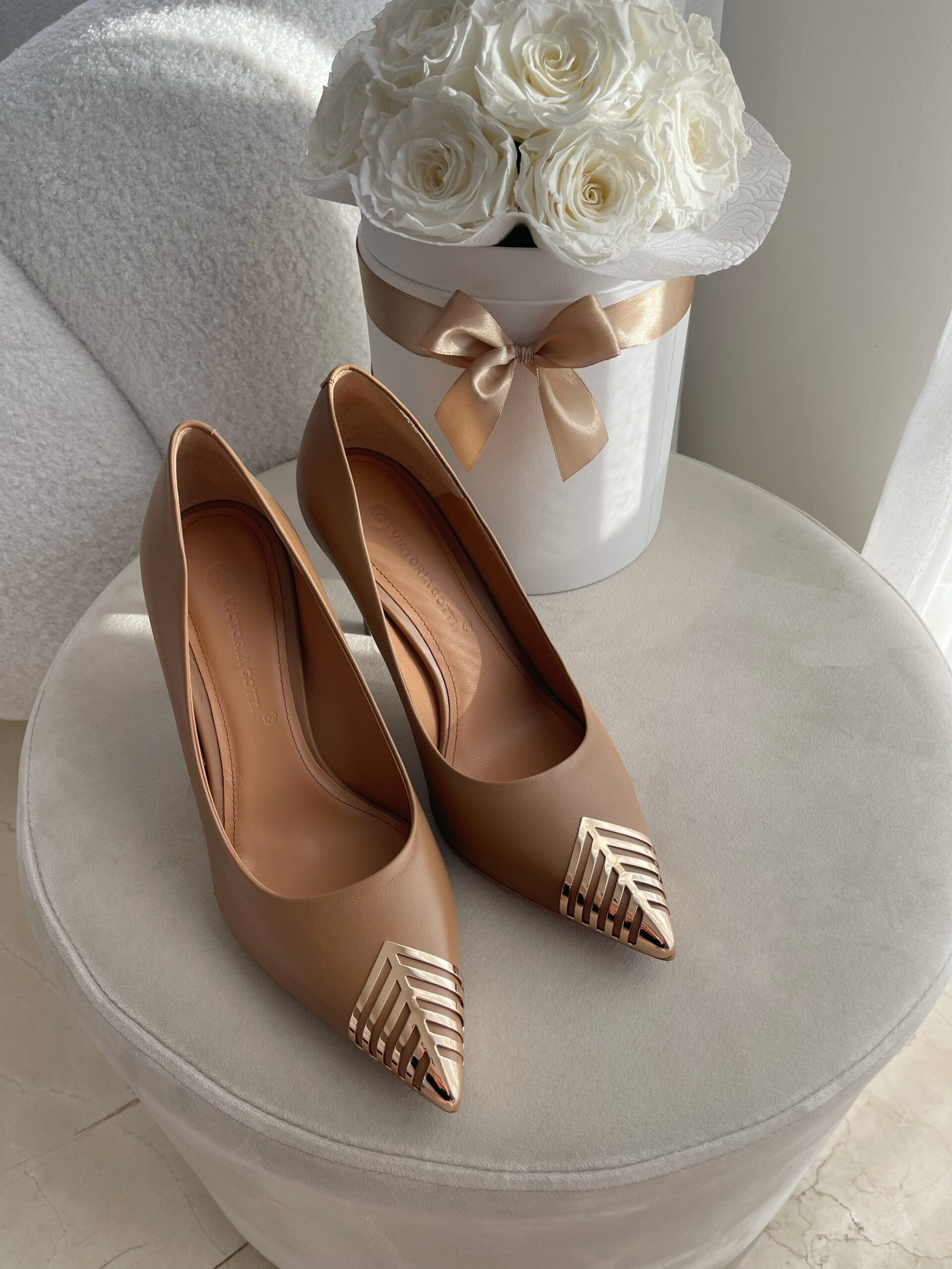 Eleganckie brązowe czółenka damskie na szpilce wykonane z naturalnej skóry licowej. Złota ozdoba, nosek w szpic i obcas 9 cm tworzą idealny model do biura i stylizacji wizytowych. Dostępne również w klasycznym czarnym kolorze 👉🏻 Czółenka DALLI BLACK