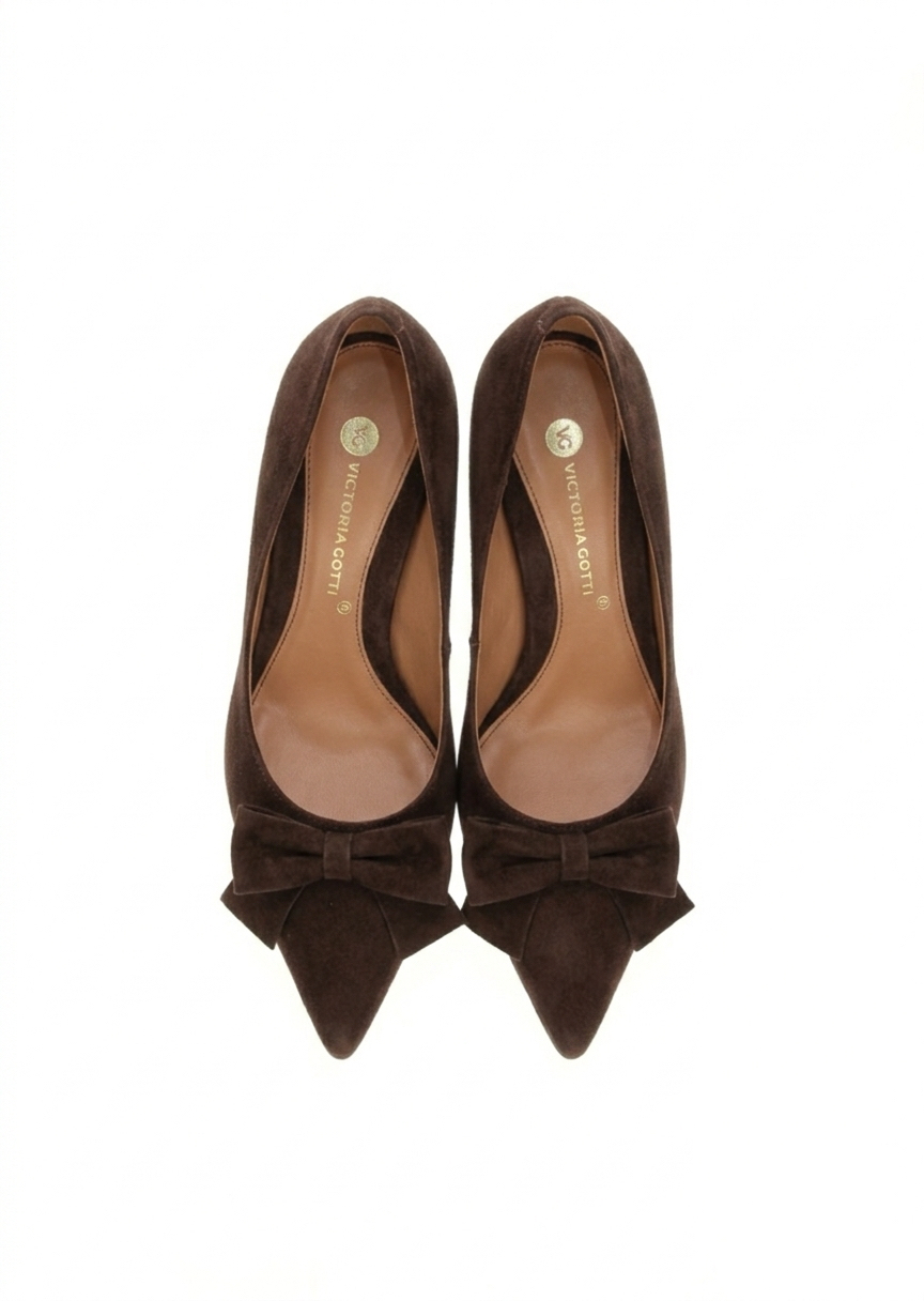✓ Brązowe zamszowe czółenka damskie z kokardką