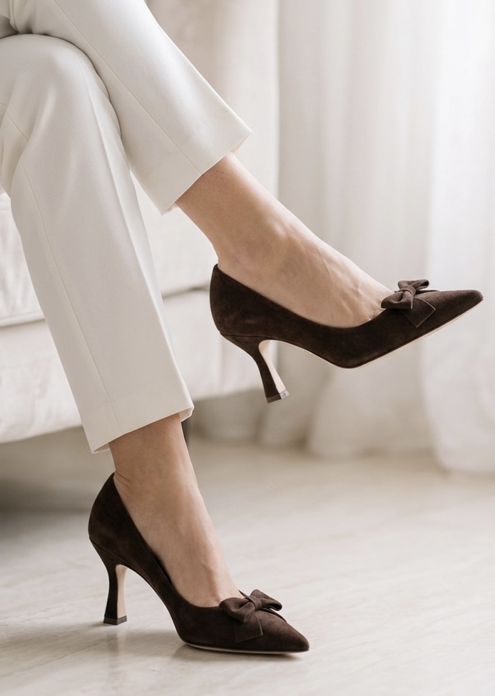 Minimalistyczny fason sprawia, że brązowe zamszowe czółenka damskie z kokardką SANDRA pasują do wielu stylizacji. Na przykład, pięknie wyglądają z sukienką midi, ołówkową spódnicą lub karmelowym garniturem. Ponadto, uniwersalny czekoladowy odcień harmonizuje z beżem, kremem, czernią i złotymi dodatkami ✨.