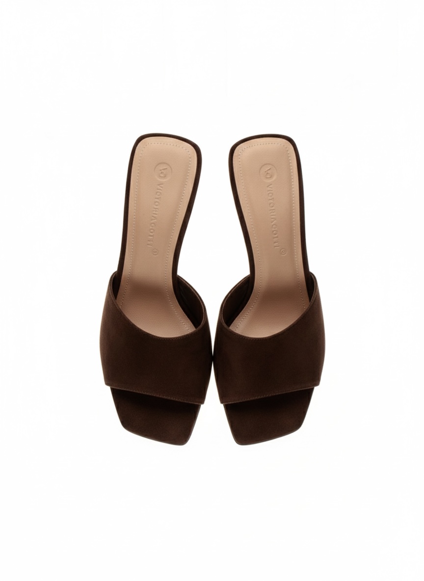 Eleganckie klapki z naturalnej skóry zamszowej w głębokim czekoladowym odcieniu brązu. Stabilny obcas 5 cm i polska, ręczna produkcja gwarantują komfort oraz ponadczasowy styl.