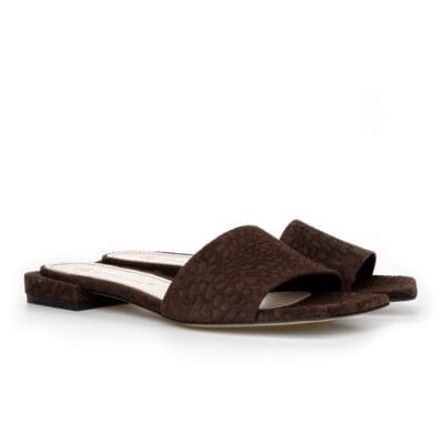 Klapki CLARIE TOFFEE wykonane z naturalnej włoskiej skóry naturalnej w przepięknym camelowym kolorze. Skóra posiada tłoczenia, które strukturą przypominają krokodyla. Są bardzo lekkie i wygodne, idealne na ciepłe dni. Są osadzone na bardzo niskim obcasie.