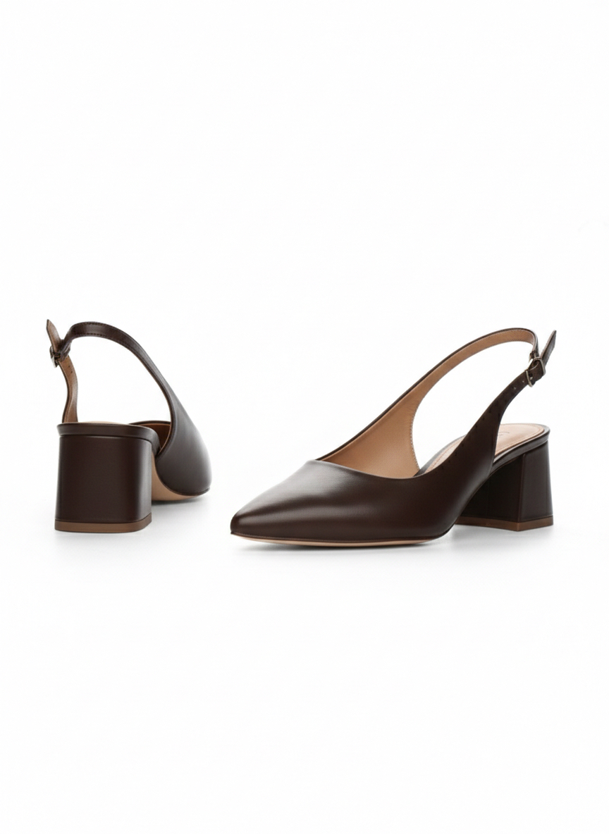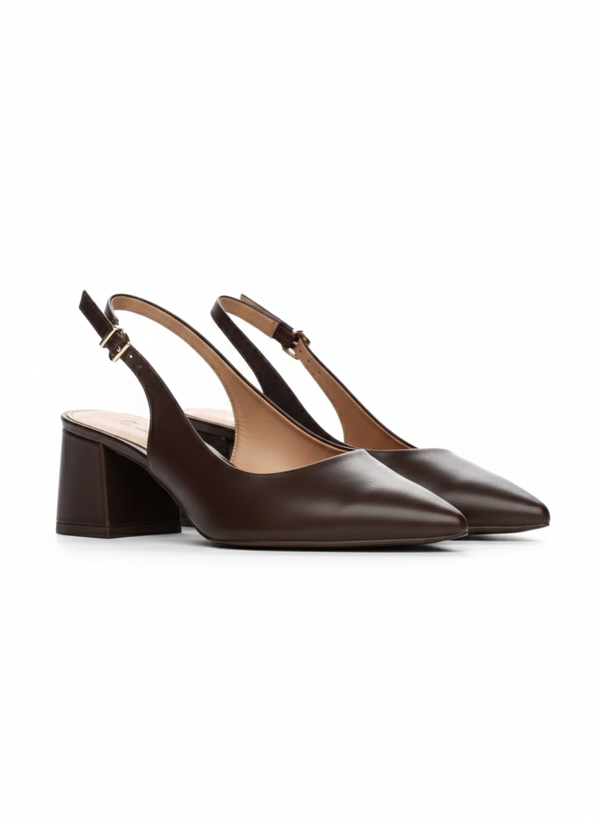 Brązowe czółenka z odkrytą piętą LIVIA BROWN to połączenie klasyki z subtelną świeżością. Ponieważ wykonano je z naturalnej skóry licowej w głębokim czekoladowym odcieniu, buty prezentują się elegancko i stylowo 🤎. Co więcej, odkryta pięta oraz regulowane zapięcie na złotą sprzączkę nadają modelowi lekkości i nowoczesnego charakteru ✨
