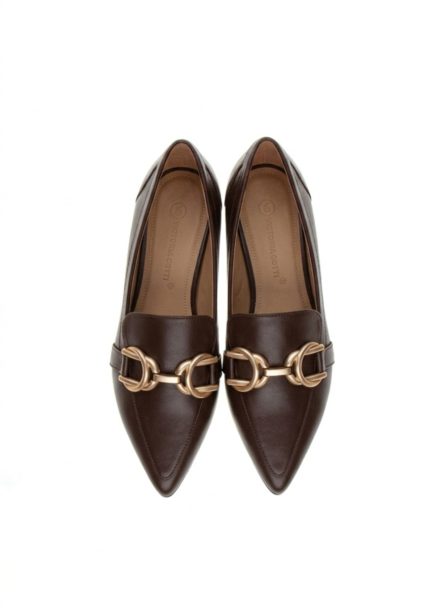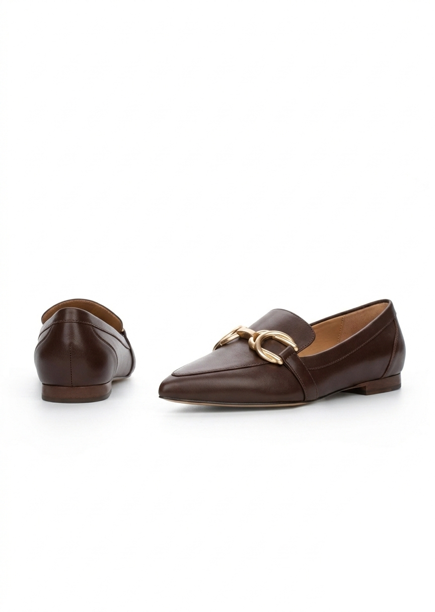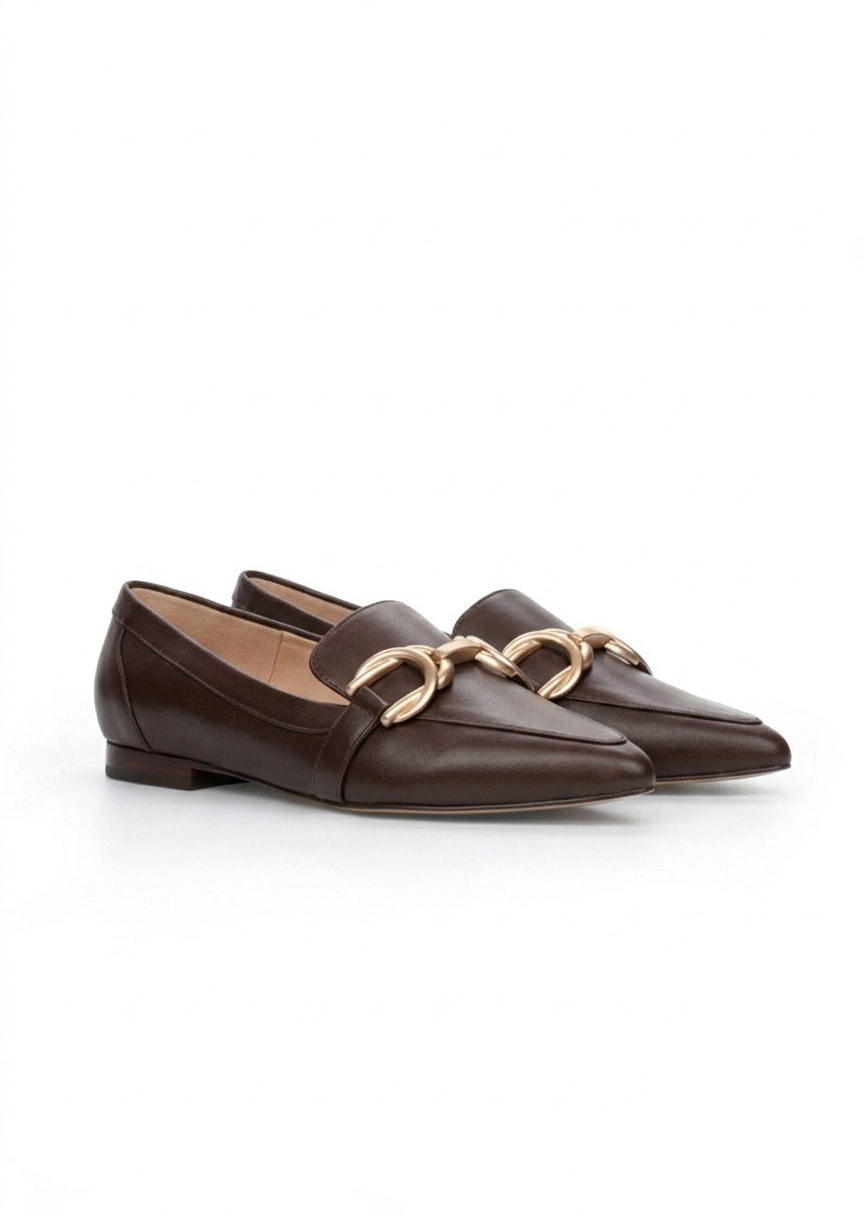 Eleganckie brązowe skórzane mokasyny ANN BROWN z płaskim obcasem i złotym łańcuszkiem. Komfortowe, lekkie i idealne na każdy dzień. Sprawdź je również w zamszowej odsłonie TUTAJ